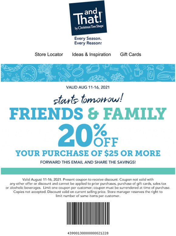 Get 20% Off Your Purchase at Christmas Tree Shops (In-Store or ... Jul 1, 2022 ... Save with Christmas Tree Shop Friends and Family coupon. Savings of 20% off your total order. This event only happens once a year, ... Deals - Christmas Tree Shops - Home Decor, Furniture & Gifts Store Want to receive SMS alerts? Text Deals to 66763. Remember, first-time subscribers receive a coupon for $10 off your in-store purchase of $50 or more. › wixWix - Home - Facebook Wix, San Francisco, California. 4,569,863 likes · 11,324 talking about this. Wix.com is a platform that gives you the freedom to create, design, manage and develop your web presence exactly the way... Christmas Tree Shops Friends And Family Coupon October 2022 Christmas Tree Shops Friends And Family Coupon - 61 Promo Codes save averagely $24.89 per order after using Coupons.