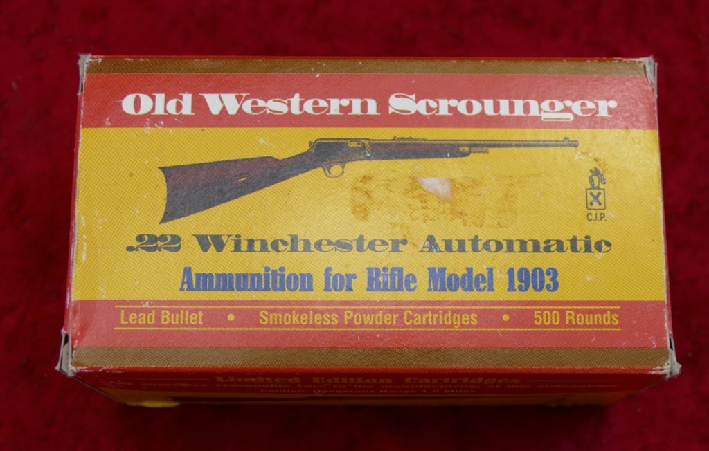 Old Western Scrounger 22 Winchester Automatic Ammo 200 Rds Model 1903 Description: This is a lot of 4 full boxes, 200 original rounds, of .22 Winchester Automatic ammunition manufactured by Old Western Scrounger with 45 grain bullets. Made for the Winchester rifle model 1903 the boxes call out the rifle designation on the limited edition boxes. Boxes and cartridges are in excellent condition.